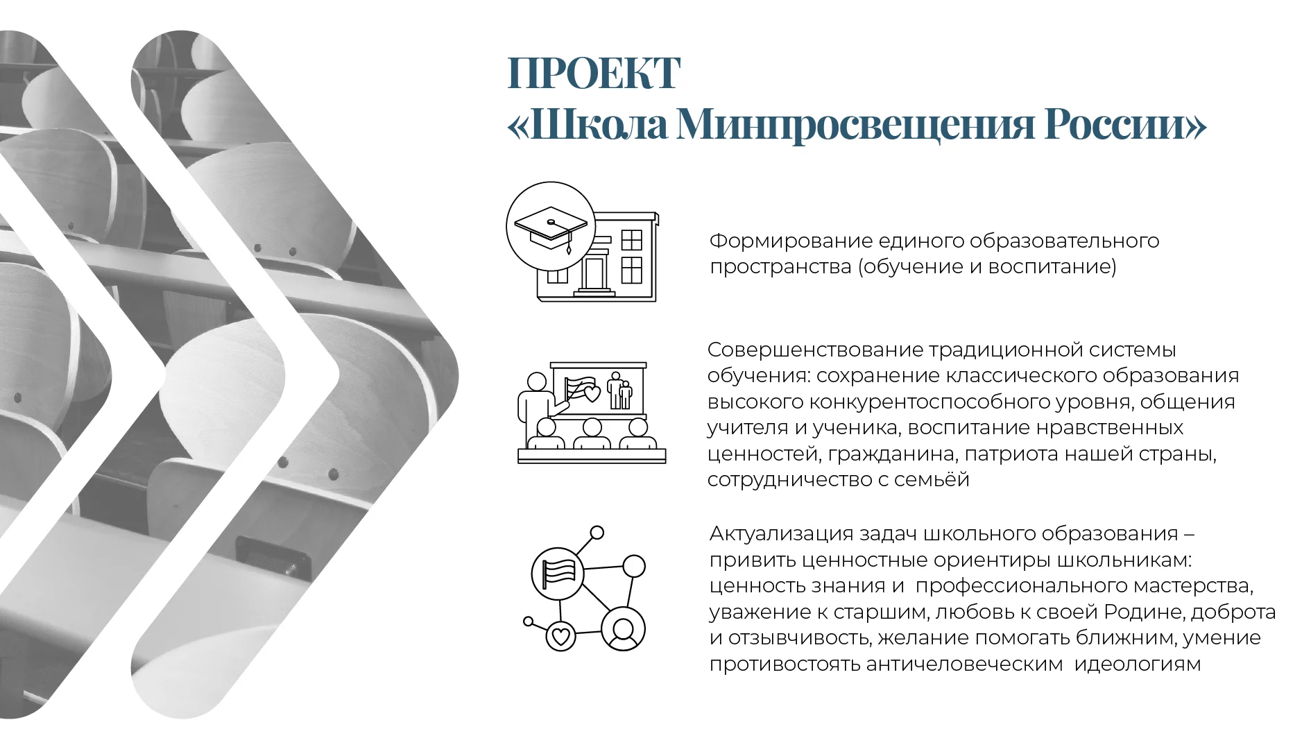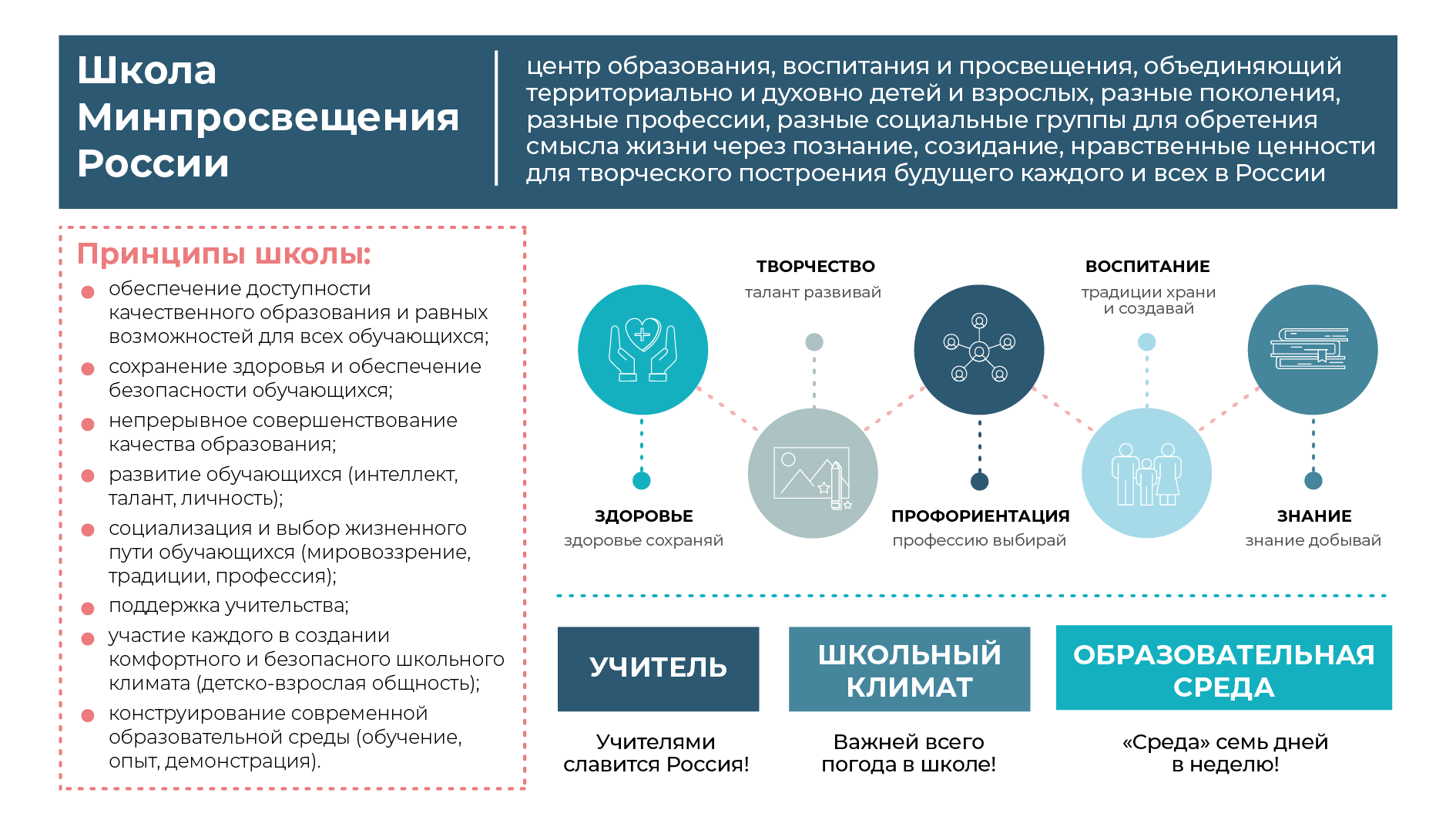 Центр образования, воспитания и просвещения, объединяющий территориально и духовно детей и взрослых, разные поколения, разные профессии, разные социальные группы для обретения смысла жизни через познание, созидание, нравственные ценности для творческого построения будущего каждого и всех в России.