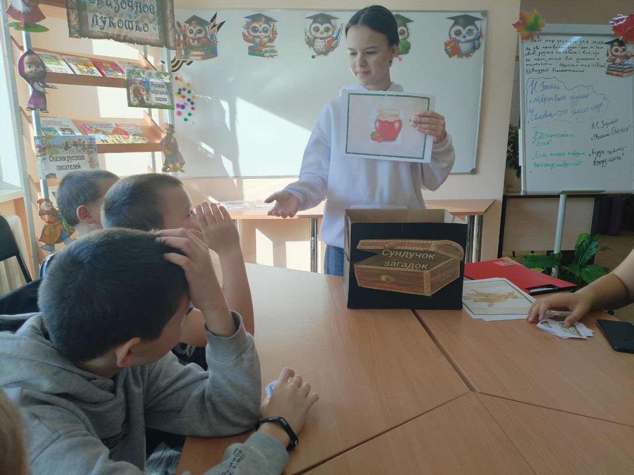 В дни осенних каникул в школьной библиотеке прошла литературно-игровая программа "Сундучок загадок" по сказкам. Дети продемонстрировали отличное знание сказок отечественных и зарубежных писателей. Ведь сказки учат нас отличать добро от зла, хорошее от плохого. Ребята отправились в путешествие по удивительному миру сказок. Детям были предложены загадки по прочитанным сказкам, проведена викторина "Угадай сказку по событиям", "Угадай героя".