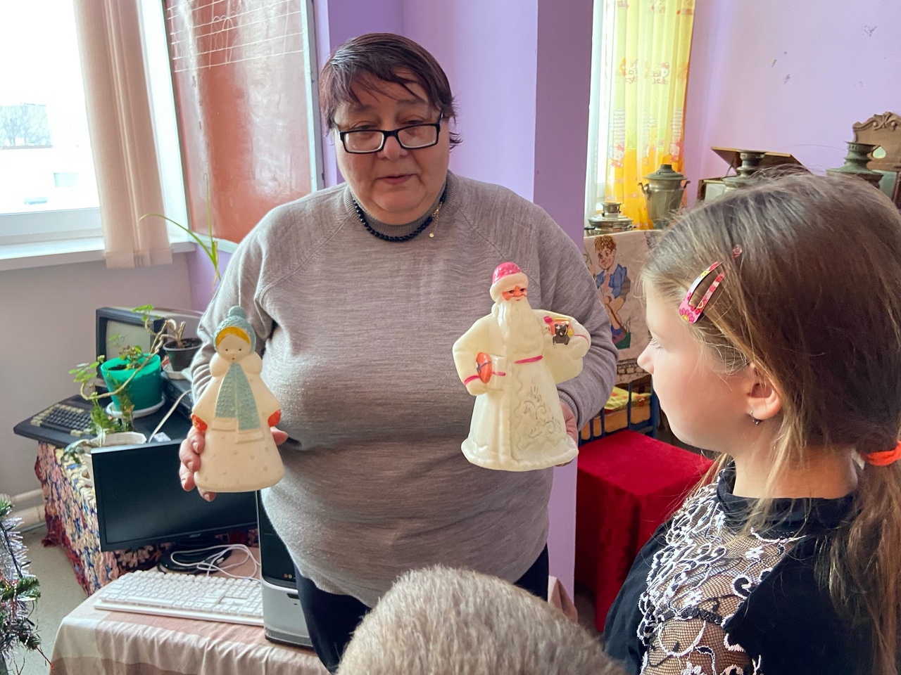 Ребята начальных классов побывали на экскурсии в музейной комнате на исторической новогодней ёлке. Игрушки на ёлке – 60-летней – 70-летней давности. Дети узнал историю появления елочных игрушек. Первые елочные игрушки появились давно, они были съедобными, это были вафельные и сахарные фигурки, конфеты, орехи, яблоки, печенье. Их очень любили дети. И вот в течение праздничной ночи сладости съедали, а елку выбрасывали. Праздник получался очень коротким. Но потом люди задумались, как же продлить праздник. И придумали, конфеты и печенье упаковывать в красивые обертки, угощения съедались, а вот яркие обертки оставались. Именно упаковки из-под сладостей и считаются первыми елочными украшениями в российских домах. А еще были украшения для елки из ленточек, соломы, затем появились ватные игрушки, бумажные гирлянды А еще позднее, чуть более 100 лет назад появились стеклянные игрушки. Их изготавливали из стекла люди, которых называли стеклодувы, т.е. они выдували из стекла различные игрушки. Игрушки выдувались вручную, поэтому они были очень дорогими, их не каждый мог купить, поэтому их берегли, передавали по наследству, т.е. от родителей к детям. Игрушки были разные, фантазии стеклодувов не было предела. Можно увидеть шишки, корзинки, фрукты, овощи, сказочных героев, животных солдатиков. Новые игрушки появлялись, когда в стране происходило очень важное событие, например, полет человека в космос. И сразу появилась игрушка «космонавт». Или в стране начали выращивать кукурузу, появилась игрушка «кукуруза». Шар на елке символизирует яблоко. По преданию, однажды в Германии выдался неурожай яблок, а ими всегда украшали елку. И тогда жители пришли к стеклодувам с просьбой сделать стеклянные яблоки для праздника. С тех пор шары главные среди елочных украшений.