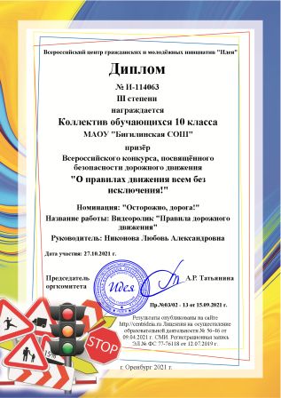 В соответствии с единым календарём массовых и методических мероприятий на 2021 - 2022 гг. Центром гражданских и молодёжных инициатив «Идея» г. Оренбурга с 15.09 по 29.11 был организован Всероссийский конкурс, посвящённый безопасности дорожного движения «О правилах движения всем без исключения!» Обучающиеся 10 класса нашей школы приняли в нем участие, создав видеоролик о правилах дорожного движения, и заняли третье место. Желаем ребята дальнейших творческих успехов.