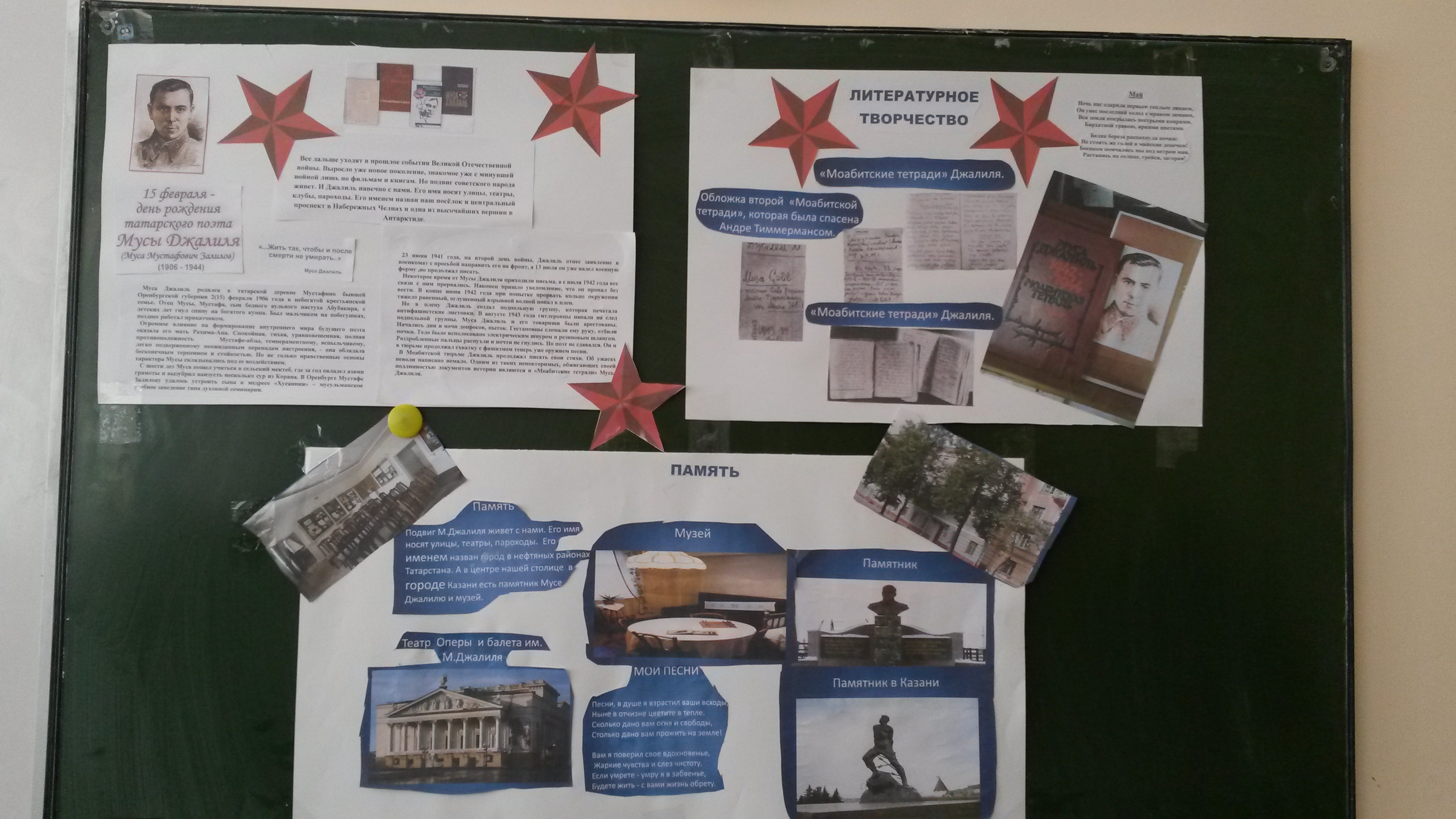 Учащиеся 7 класса нашей школы приняли участие в этой акции. Был проведен классный час, в рамках которого ребята узнали о Мусе Джалиле как поэте, читали его стихи. По окончании мероприятия была проведена викторина, вопросы которой охватывали жизненный и творческий путь Джалиля. Итогом мероприятия стал выпуск стенгазеты.