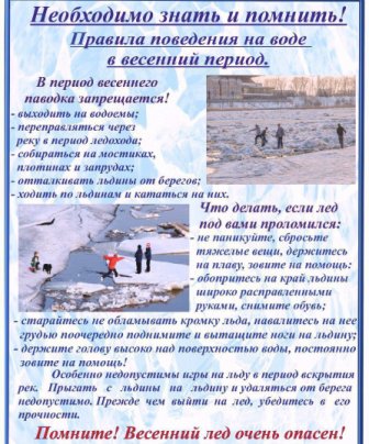 Следует помнить: Переходить водоемы весной строго запрещается! Нельзя выходить на водоемы при образовании ледяных заторов. Опасно находиться на весеннем льду водохранилищ и, особенно, рек, где имеется подледное течение. Особенно недопустимы игры на льду в период вскрытия рек. Прыгать с льдины на льдину и удаляться от берега недопустимо. Такие поступки, как правило, заканчиваются трагически.