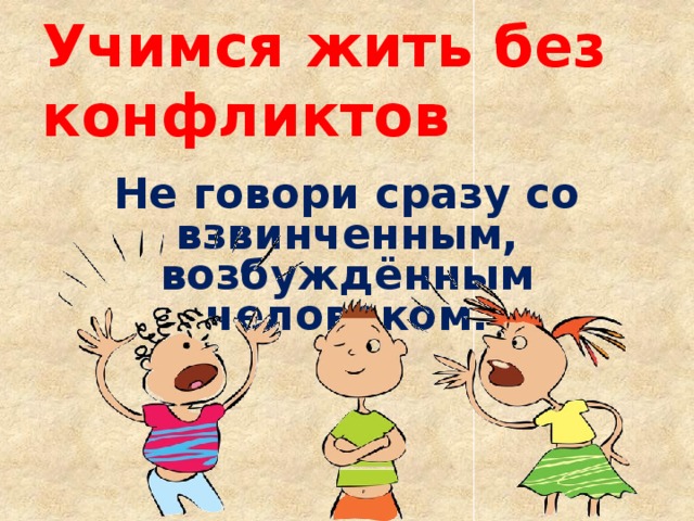 Цель: формирование представлений о природе конфликтов и культуре поведения в общении с людьми. Были использованы такие упражнения как: «Разожми кулак», «Ловим комаров», «Импульс». Также ребятам был предложен просмотр видеоролика «Как отвечать на оскорбления», по итогам просмотра ребята разработали способы «Как погасить в себе нарастающую агрессивность».